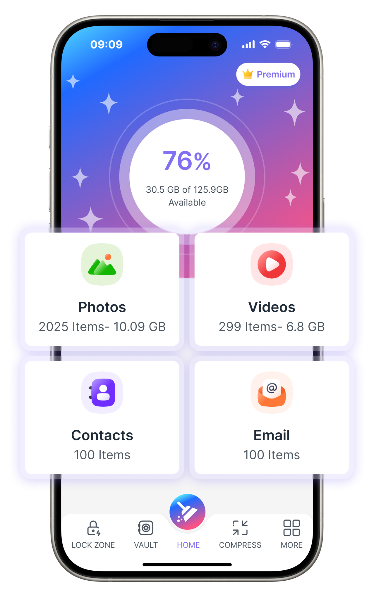 Quickly remove duplicates, blurry photos, screenshots & large videos with one tap.