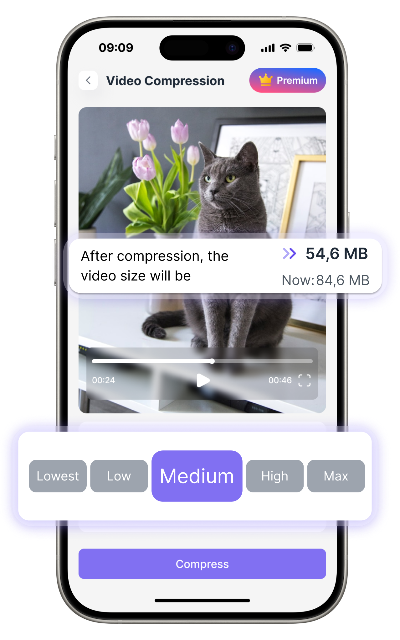 Quickly reduce video file size while keeping great visual quality. Free up your storage in seconds.